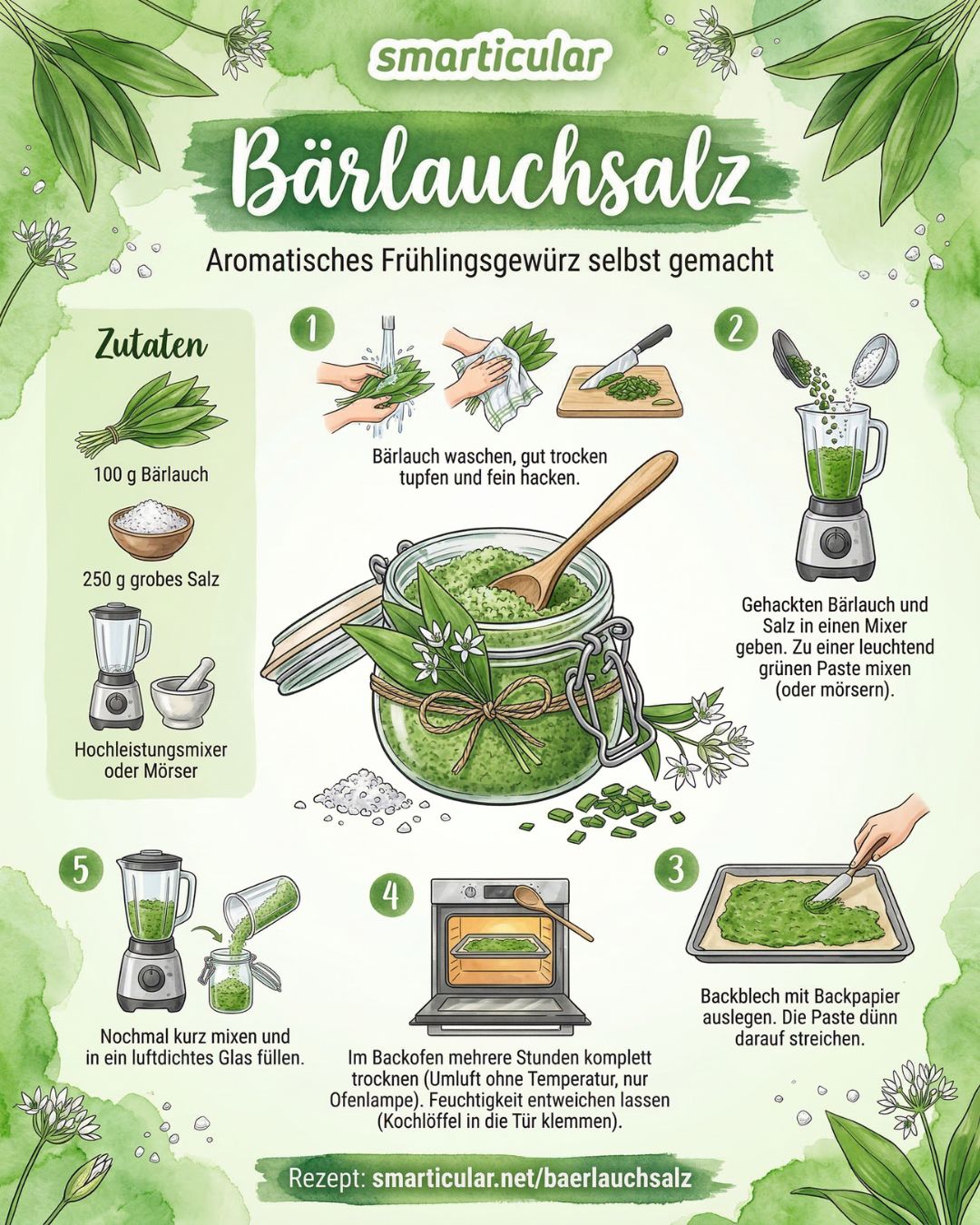 MinutenWährend Kräutersalz aus dem Handel überwiegend Salz enthält, kannst du für dein selbst gemachtes Bärlauchsalz den Kräuteranteil auf 50 bis 80 Prozent erhöhen. Das köstliche Bärlaucharoma kommt dann besonders gut zur Geltung, und das Würzsalz eignet sich auch für eine salzreduzierte Ernährung.