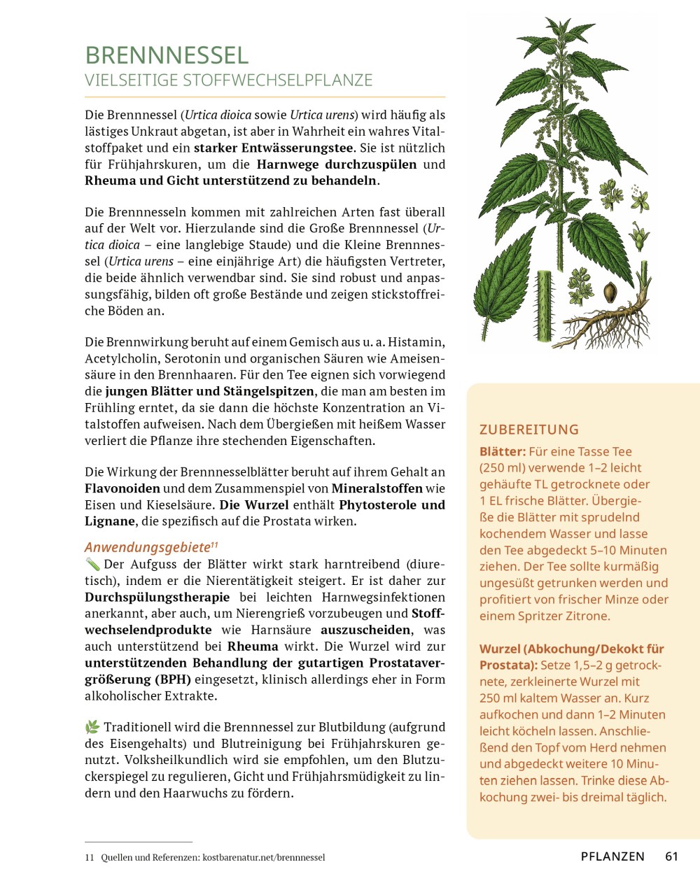 Der umfangreiche Hauptteil bietet dir systematisch aufgebaute Pflanzenprofile: mit Inhaltsstoffen, Wirklogik, bewiesenen und traditionellen Anwendungen, Zubereitung, Sammelzeiten und einem übersichtlichen Steckbrief.