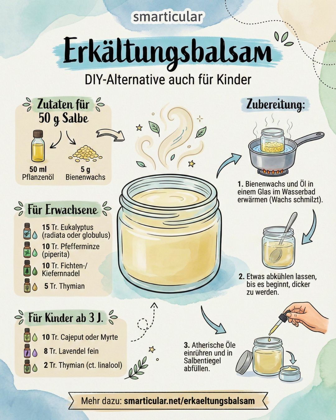 Hallo Julia, wenn der Erkältungsbalsam bei Kindern angewendet werden soll, dürfen nicht alle ätherischen Öle verwendet werden. Welche du nehmen kannst, steht oben in der Liste. Hier gibt es noch mehr Informationen zum Umgang mit ätherischen Ölen bei Kindern: https://www.smarticular.net/aetherische-oele-aromatherapie-erkaeltung-husten-kinderkrankheiten/. Aufgetragen wir der Balsam wie die handelsüblichen Produkte auch auf der Brust. Du kannst einfach mit sauberen Fingern ins Glas greifen und dir eine Portion herausholen. Lass dir am besten bei der Zubereitung und Anwendung von einem Erwachsenen helfen! Liebe Grüße Sylvia