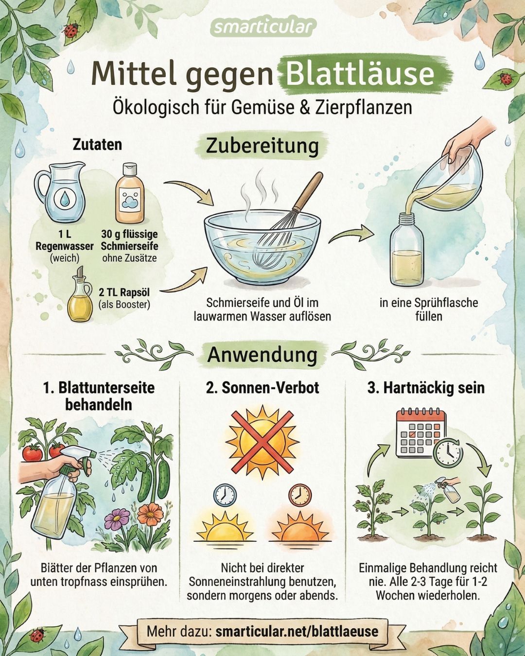 Hallo Kathrin, im unteren Teil des Beitrags sind sanftere Alternativen verlinkt. Wir empfehlen, erst diese auszuprobieren, bevor man zur Schmierseife greift. Auch sollte man Gemüse und Salat nicht mit Schmierseife behandeln, wenn man diese kurze Zeit später ernten möchte. Liebe Grüße Sylvia