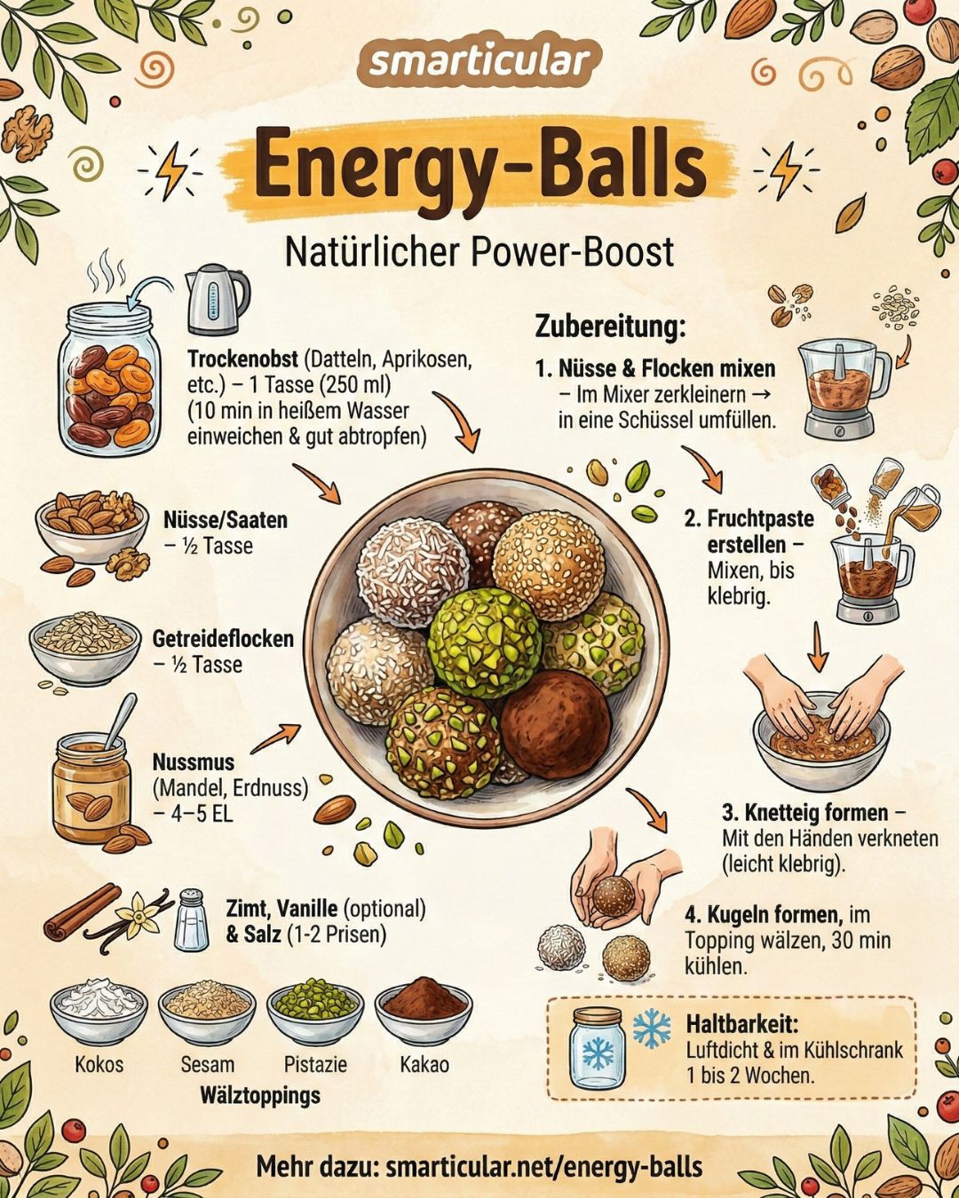 MinutenMit diesem Universalrezept lassen sich die Bestandteile der Power-Kugeln individuell variieren. Experimente auf dem Weg zu deinem persönlichen Lieblingsrezept sind deshalb ausdrücklich erlaubt und empfohlen. Je nach Beschaffenheit der gewählten Zutaten muss ihr Verhältnis gegebenenfalls leicht angepasst werden, sodass am Ende eine gut form- und portionierbare Masse entsteht.