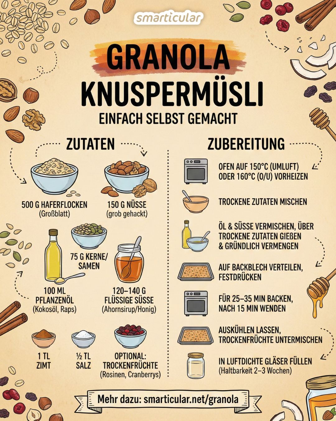 Nach dem Backen lässt sich das Granola außerdem mit (selbst) getrockneten Früchten wie etwa Rosinen, Äpfeln oder Beeren aufpeppen. Damit das Müsli knackig bleibt und nicht vorzeitig verdirbt, ist es jedoch wichtig, dass die Früchte keine Feuchtigkeit mehr enthalten.