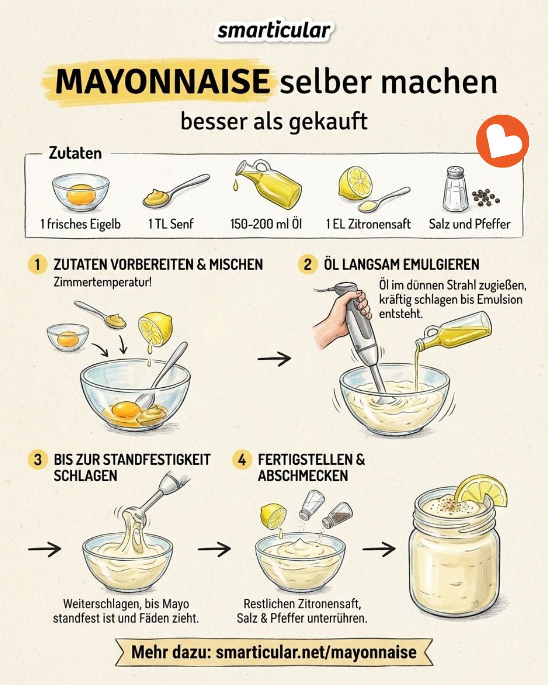 MinutenDie Zutaten für ein Glas selbst gemachte Mayonnaise sind sehr überschaubar.