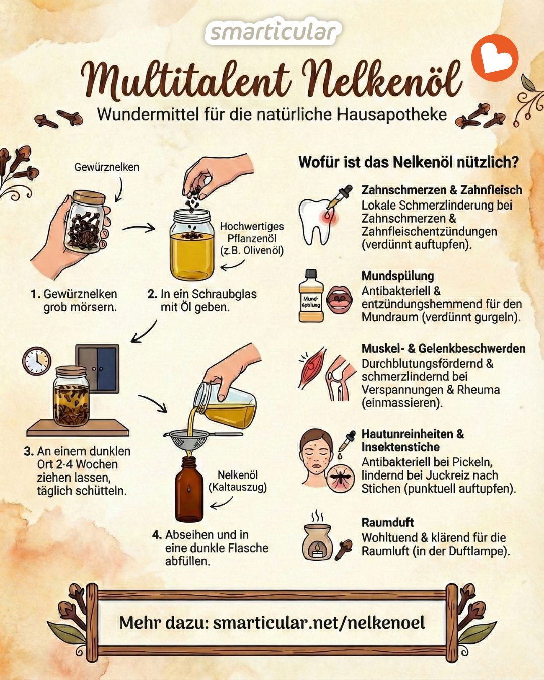- Vorgehen: Mische die zerstoßenen Nelken und das Öl direkt in einem dunklen Glas.