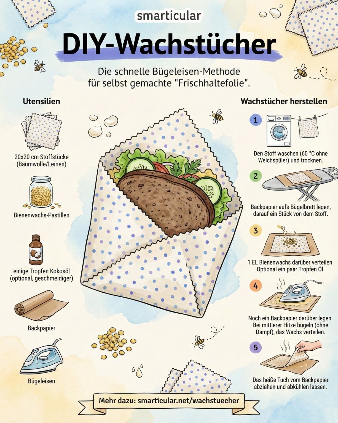 Im Handel erhältliche Wachstücher bestehen meist aus Baumwoll- oder Leinenstoff sowie Bienenwachs, das manchmal noch mit Ölen und Harzen gemischt wird. Solche Wachstücher kannst du aber auch ganz einfach selber machen. So lassen sich Größe, Material und Muster selbst bestimmen und gleichzeitig Stoffreste recyceln. Wenn du statt Bienenwachs pflanzliches Wachs verwendest, sind deine Frischhaltetücher außerdem vegan.