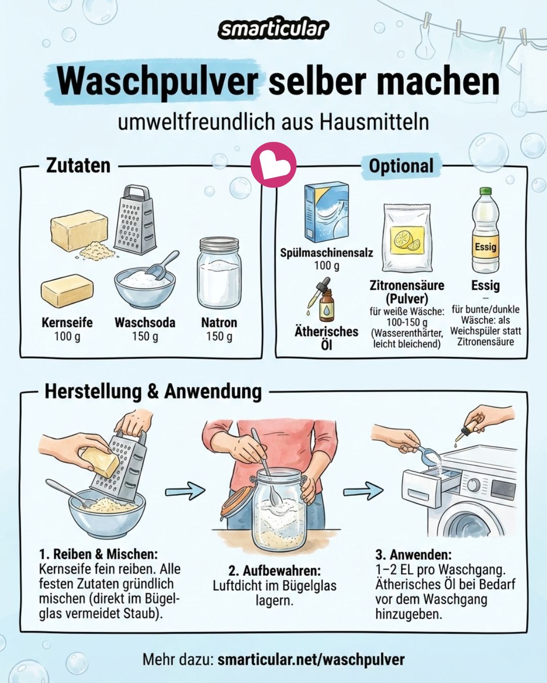 Liebes Smarticular Team! Vielen Dank für diese Infos und Tipps! Wir sind ein 5 Personen Haushalt und ich wasche jetzt seit ca. 7 Wochen mit dem Waschpulver nach eurem Rezept. Die Waschleistung entspricht genau der eines gekauften, teuren Markenwaschpulvers. Ich wasche mit gutem Gewissen der Umwelt gegenüber, schone meinen Geldbeutel erheblich und tue unserer (Familie) Gesundheit was gutes (wer kennt nicht allergische Reaktionen der Haut auf die stark parfümierten Waschmittel?)!