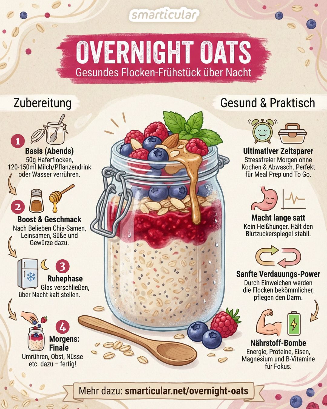 MinutenIm Grunde handelt es sich bei Overnight Oats um einen ballaststoffreichen Getreidebrei, den du nach dem Baukastenprinzip um vitalstoffreiche Zutaten wie frische saisonale Früchte, Nüsse und Gewürze erweitern und nach Geschmack variieren kannst. Das Besondere ist, dass die Zubereitung in zwei Schritten erfolgt und du den ersten Teil schon am Vorabend erledigen kannst.