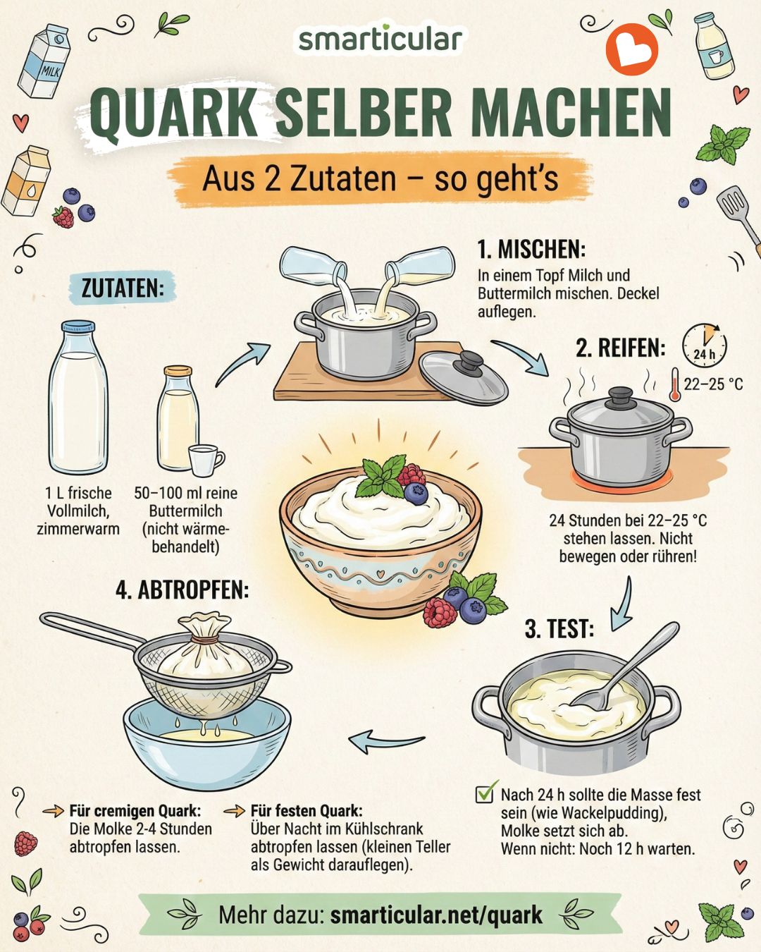 Quark entsteht, wenn Milch sauer wird und sich die Milch in Eiweiß und die Restflüssigkeit (Molke) trennt. Um diesen Prozess anzuschieben, brauchst du der Milch lediglich etwas Buttermilch zuzusetzen und etwa einen Tag zu warten, bis die Milch durch die sich vermehrenden Milchsäurebakterien ausflockt. Eine schnellere Variante mit Zitrone ist schon nach wenigen Stunden fertig. Auch aus bereits sauer gewordener Rohmilch (aber nur aus dieser!) kannst du Quark zubereiten.