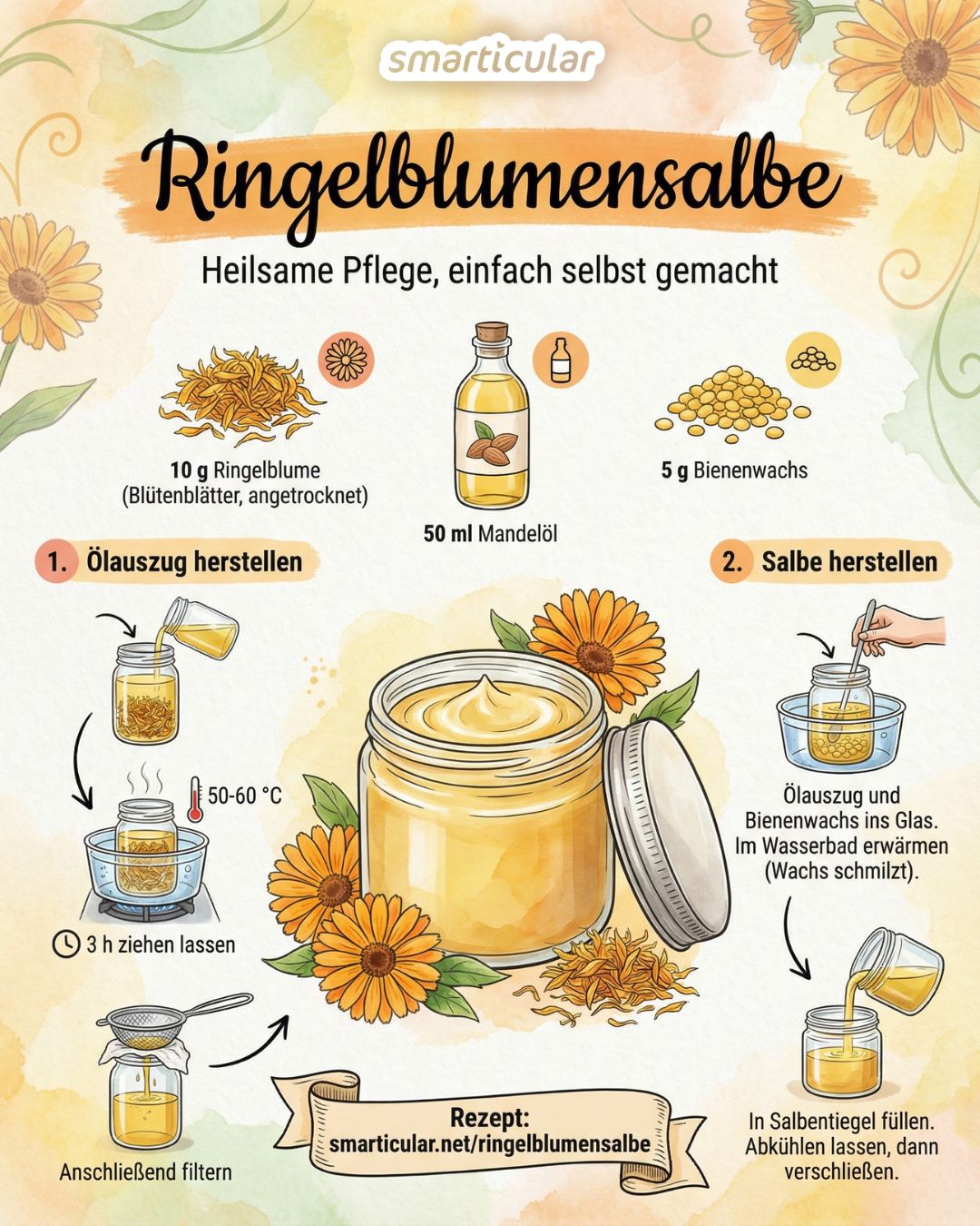 Hast du schon einmal Ringelblumenöl oder -salbe selbst gemacht? Wie sind deine Erfahrungen bei der Herstellung und Anwendung?
