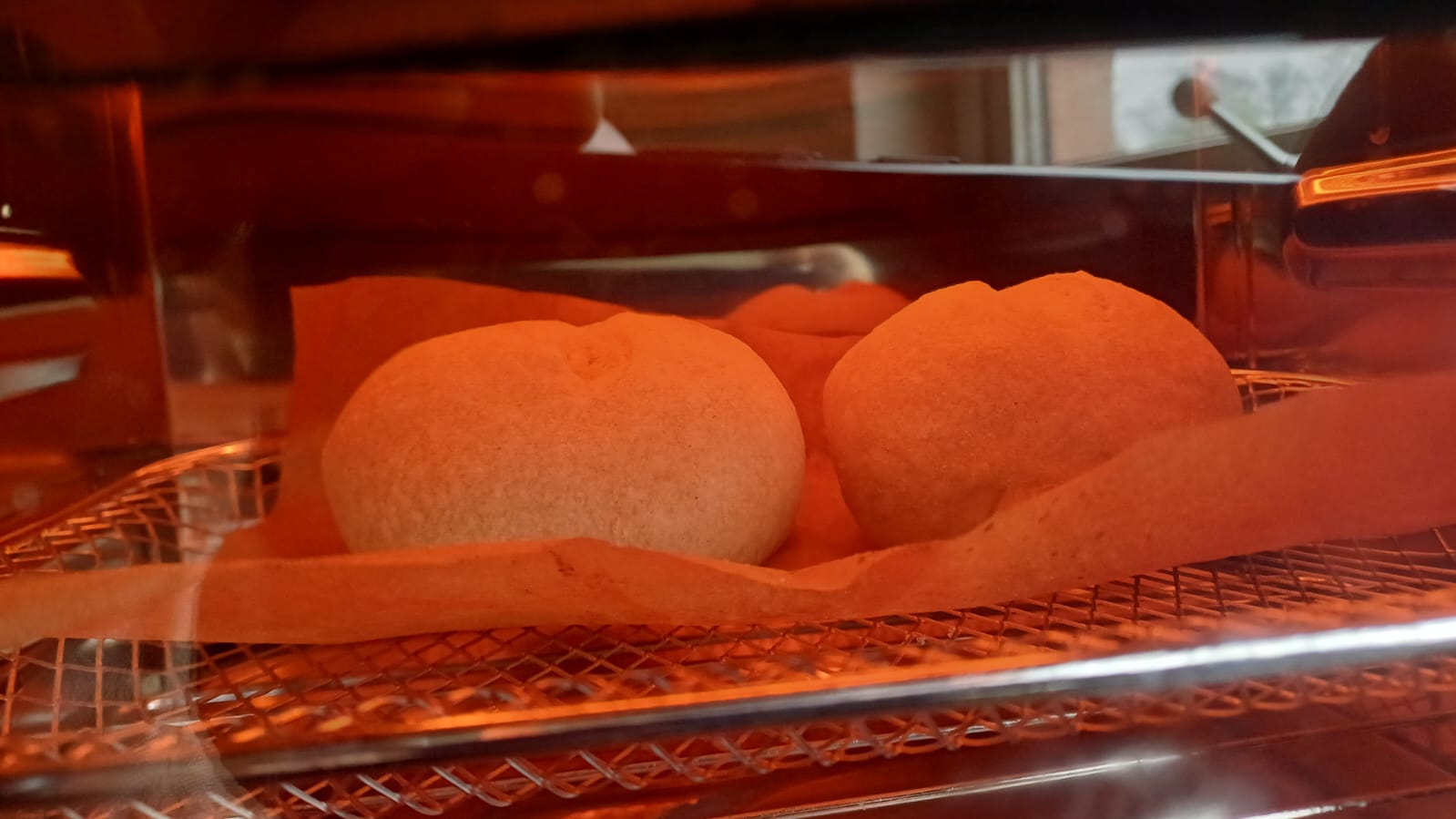 - Die Backtemperatur nach zehn Minuten auf 200 °C reduzieren und die Tür kurz öffnen, damit Feuchtigkeit entweichen kann. Die Brötchen für etwa 20-30 Minuten fertigbacken.