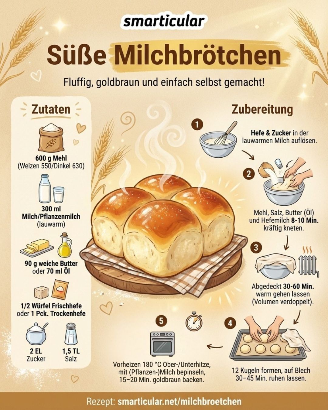 Das ist genau das richtige leicht zu merkende Rezept für mich – werde ich direkt mal ausprobieren, da meine Tochter und ich Milchbrötchenfans sind, ich aber bisher nur normale Brötchen gebacken habe …