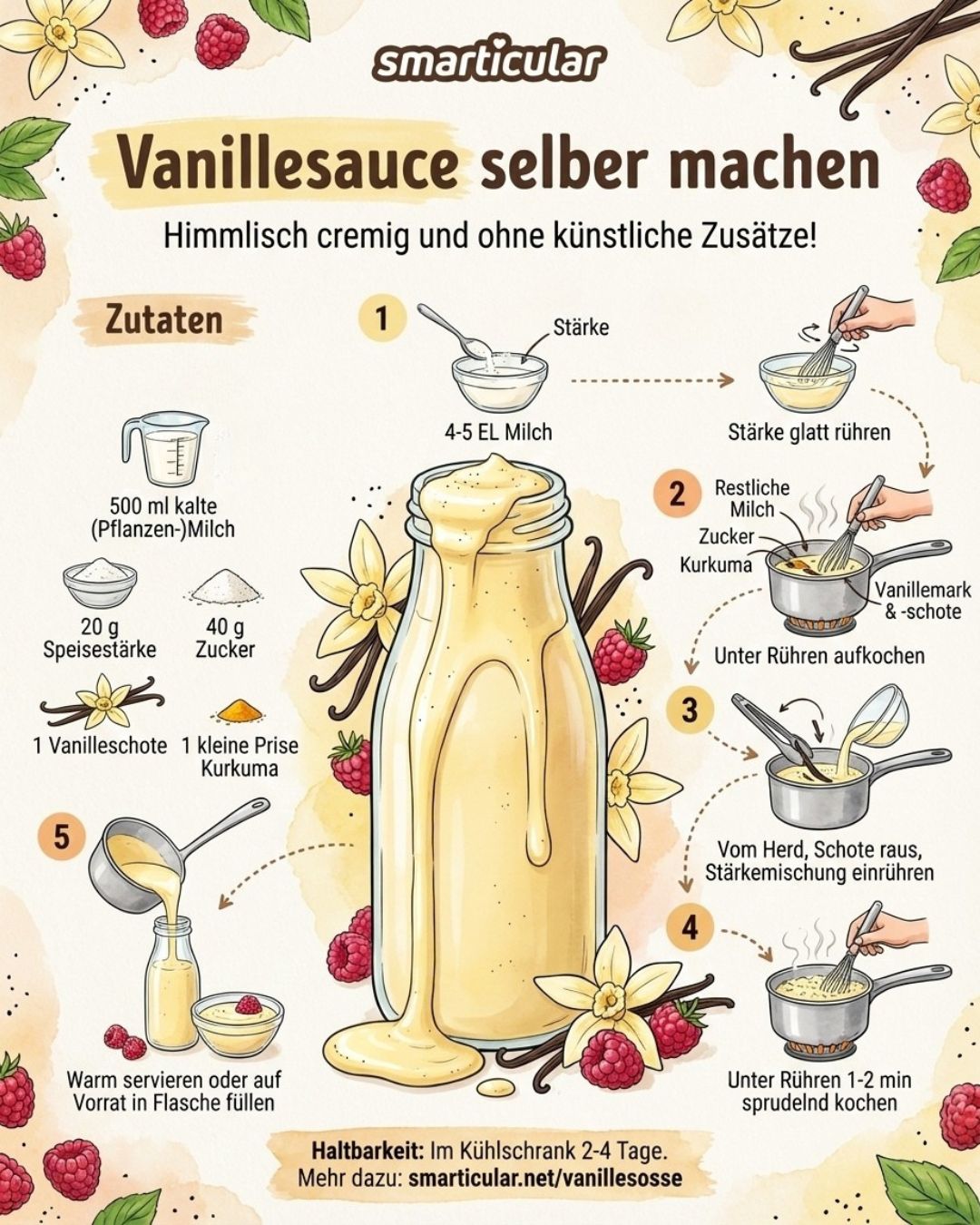 - Noch einfacher gelingt die Vanillesoße, wenn du statt Zucker und Vanillemark oder -schote (selbst gemachten) Vanillezucker verwendest.