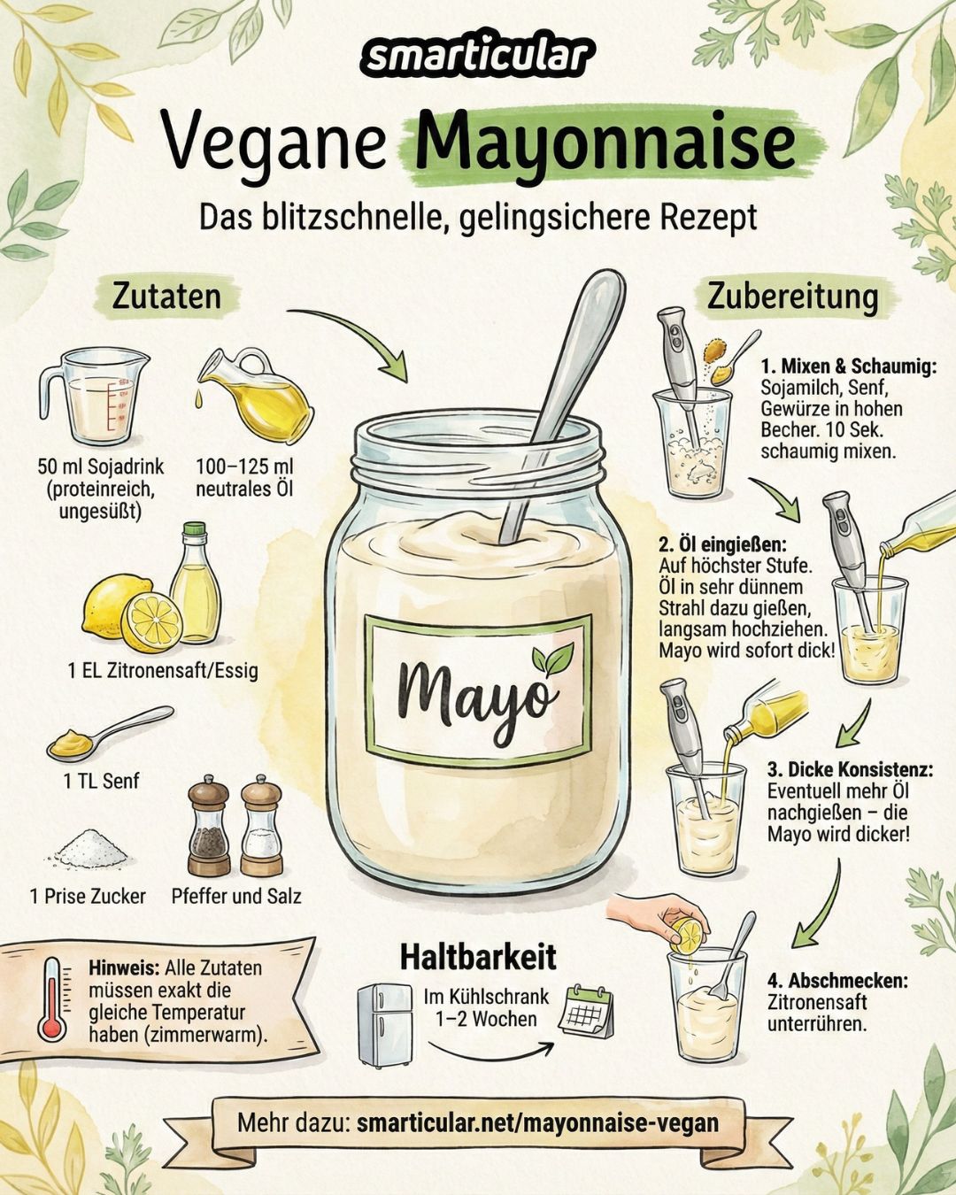 Hinweis: Alle Zutaten müssen exakt die gleiche Temperatur haben (zimmerwarm). Die Zubereitung der veganen Mayo funktioniert mit Sojamilch am besten, da sie natürliches Lecithin enthält. Mit anderem veganen Milchersatz wird die Mayonnaise nicht so steif, oder die Zutaten verbinden sich nicht zu einer homogenen Masse.